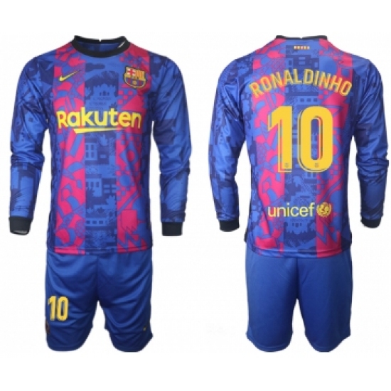 >Men 2021-2022 Club Barcelona Second away blue Long Sleeve 10 Soccer Jersey