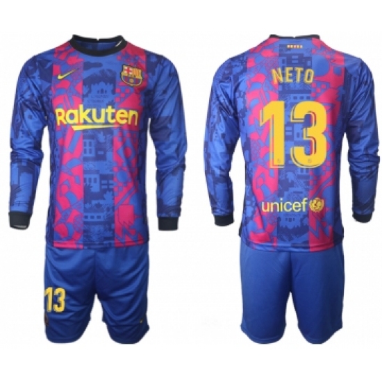 >Men 2021-2022 Club Barcelona Second away blue Long Sleeve 13 Soccer Jersey