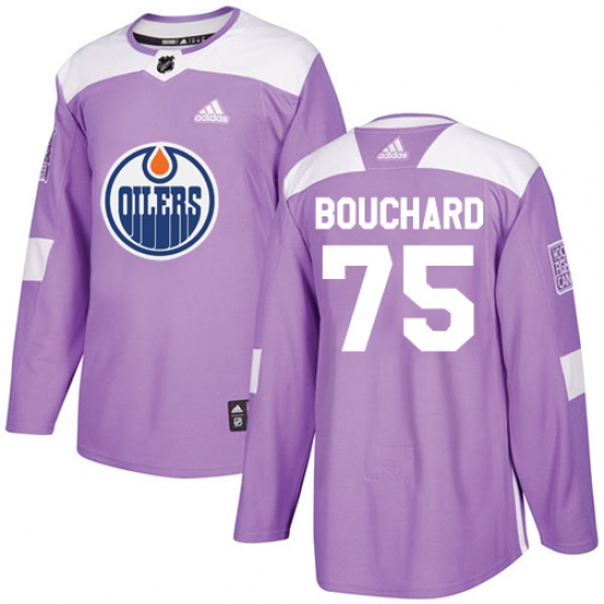 >Men's Adidas Edmonton Oilers #75 Evan Bouchard Authentic Purple Fights Cancer Practice NHL Jersey