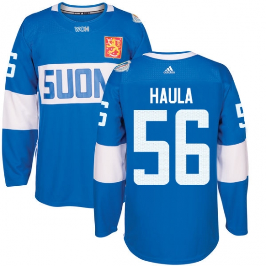 Men's Adidas Team Finland #56 Erik Haula Authentic Blue Away 2016 World Cup of Hockey Jersey