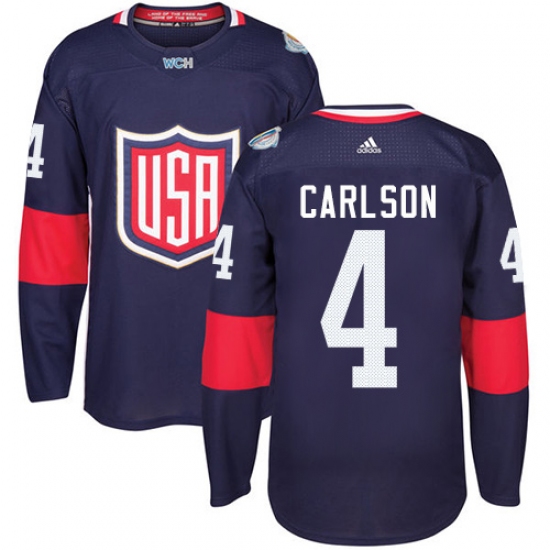 Men's Adidas Team USA #4 John Carlson Authentic Navy Blue Away 2016 World Cup Ice Hockey Jersey