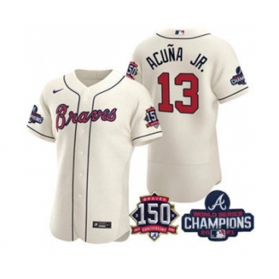 Men's Atlanta Braves #13 Ronald Acuna Jr. 2021 Cream World Series Champions With 150th Anniversary Flex Base Stitched Jersey