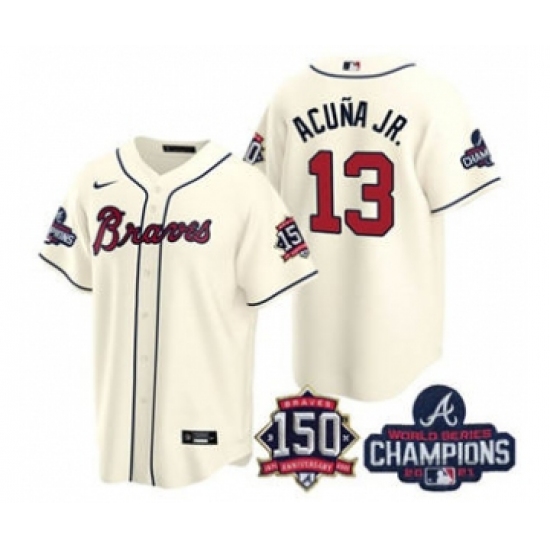 Men's Atlanta Braves #13 Ronald Acuna Jr. 2021 Cream World Series Champions With 150th Anniversary Patch Cool Base Stitched Jersey