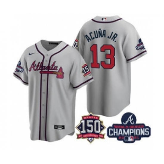 Men's Atlanta Braves #13 Ronald Acuna Jr. 2021 Gray World Series Champions With 150th Anniversary Patch Cool Base Stitched Jersey