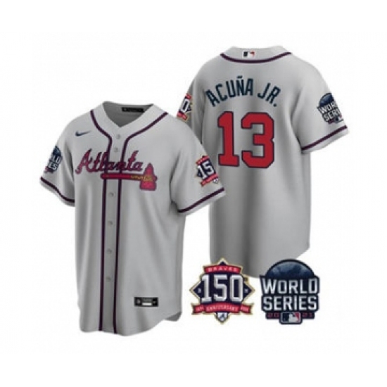 Men's Atlanta Braves #13 Ronald Acuna Jr. 2021 Gray World Series With 150th Anniversary Patch Cool Base Baseball Jersey