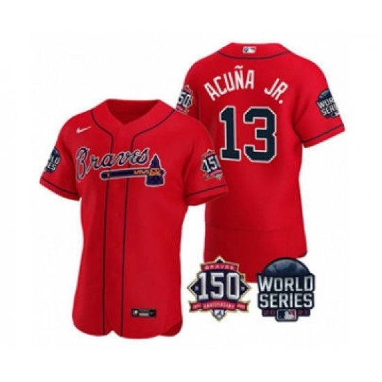 Men's Atlanta Braves #13 Ronald Acuna Jr. 2021 Red World Series Flex Base With 150th Anniversary Patch Baseball Jersey