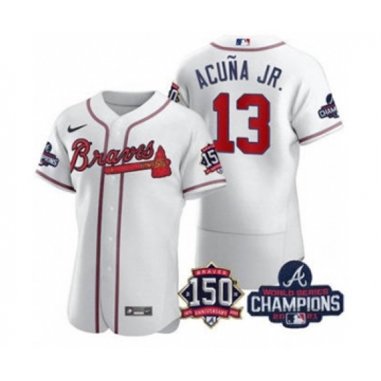 Men's Atlanta Braves #13 Ronald Acuna Jr. 2021 White World Series Champions With 150th Anniversary Flex Base Stitched Jersey