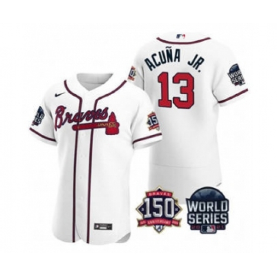 Men's Atlanta Braves #13 Ronald Acuna Jr. 2021 White World Series Flex Base With 150th Anniversary Patch Baseball Jersey