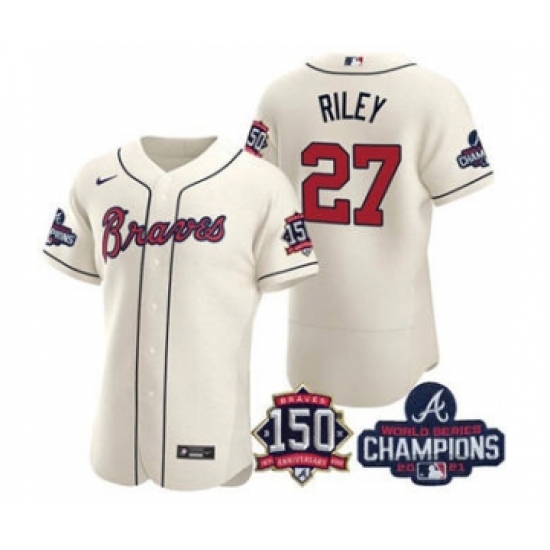 Men's Atlanta Braves #27 Austin Riley 2021 Cream World Series Champions With 150th Anniversary Flex Base Stitched Jersey