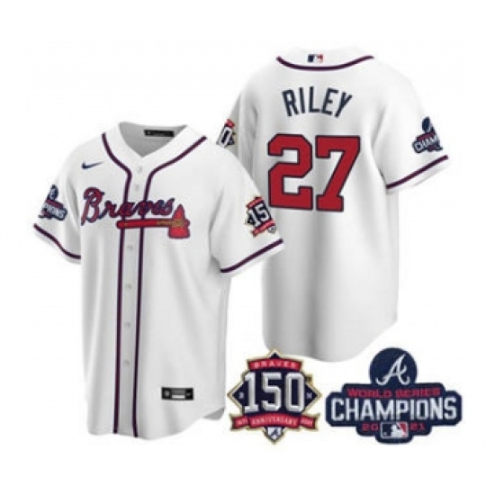 Men's Atlanta Braves #27 Austin Riley 2021 White World Series Champions With 150th Anniversary Patch Cool Base Stitched Jersey