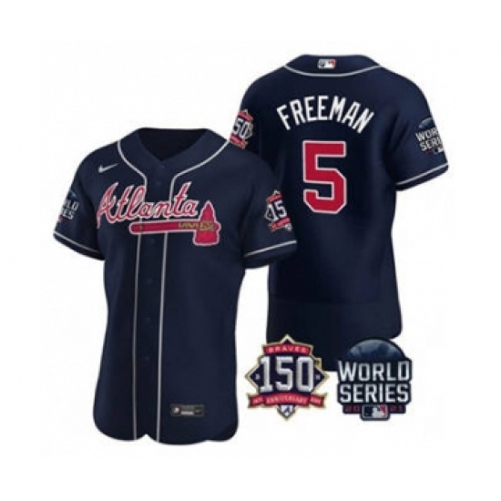 Men's Atlanta Braves #5 Freddie Freeman 2021 Navy World Series Flex Base With 150th Anniversary Patch Baseball Jersey