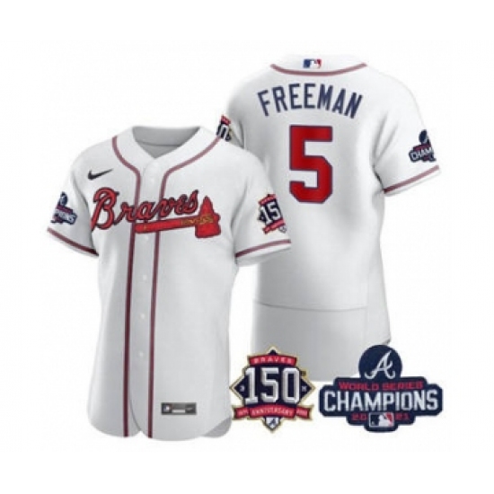 Men's Atlanta Braves #5 Freddie Freeman 2021 White World Series Champions With 150th Anniversary Flex Base Stitched Jersey