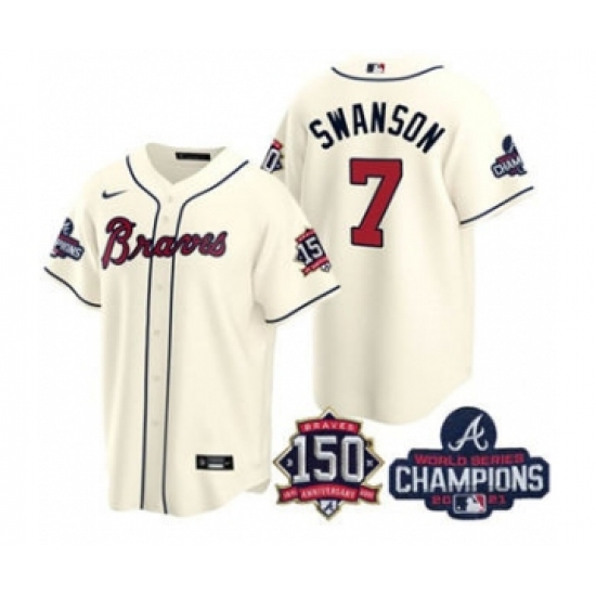 Men's Atlanta Braves #7 Dansby Swanson 2021 Cream World Series Champions With 150th Anniversary Patch Cool Base Stitched Jersey