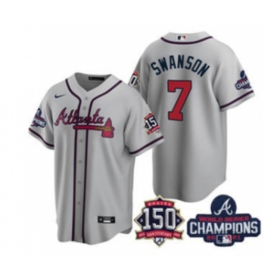 Men's Atlanta Braves #7 Dansby Swanson 2021 Gray World Series Champions With 150th Anniversary Patch Cool Base Stitched Jersey