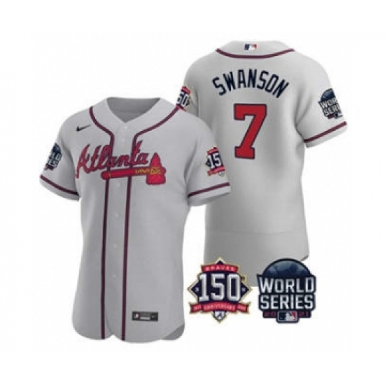 Men's Atlanta Braves #7 Dansby Swanson 2021 Gray World Series Flex Base With 150th Anniversary Patch Baseball Jersey