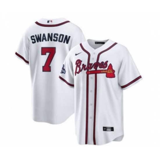 Men's Atlanta Braves #7 Dansby Swanson 2021 White World Series Champions Cool Base Stitched Jersey