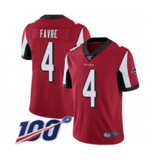 >Men's Atlanta Falcons #4 Brett Favre Red Team Color Vapor Untouchable Limited Player 100th Season Football Jersey