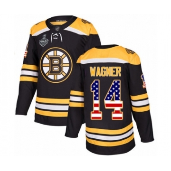 >Men's Boston Bruins #14 Chris Wagner Authentic Black USA Flag Fashion 2019 Stanley Cup Final Bound Hockey Jersey
