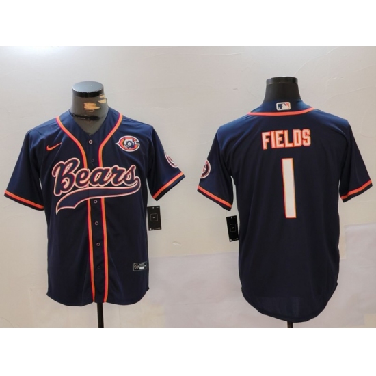 >Men's Chicago Bears #1 Justin Fields Navy Throwback With Cool Base Stitched Baseball Jersey