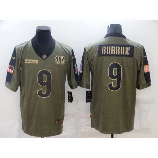 >Men's Cincinnati Bengals #9 Joe Burrow Nike Olive 2021 Salute To Service Limited Player Jersey