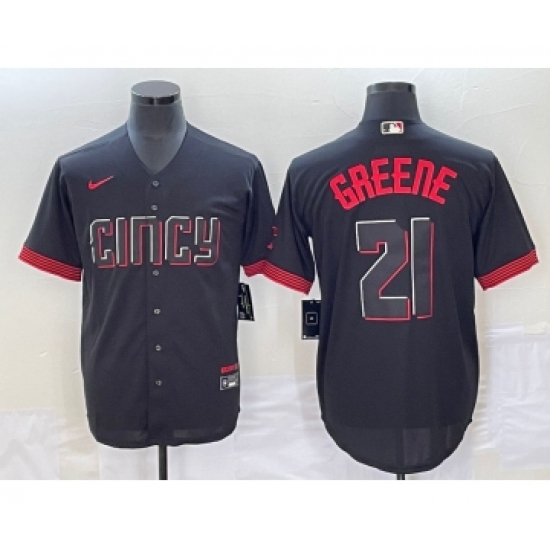 >Men's Cincinnati Reds #21 Hunter Greene Black 2023 City Connect Cool Base Stitched Jersey1