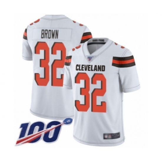 >Men's Cleveland Browns #32 Jim Brown White Vapor Untouchable Limited Player 100th Season Football Jersey