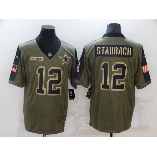>Men's Dallas Cowboys #12 Roger Staubach Olive Gold 2021 Salute To Service Limited Player Jersey