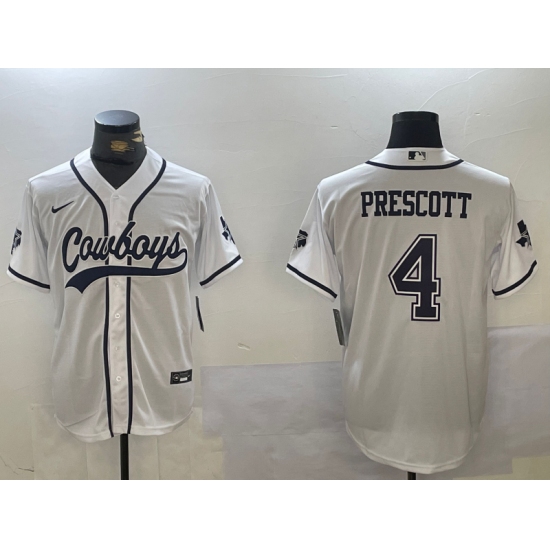 >Men's Dallas Cowboys #4 Dak Prescott White With Navy Name Cool Base Stitched Baseball Jersey
