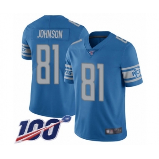 >Men's Detroit Lions #81 Calvin Johnson Blue Team Color Vapor Untouchable Limited Player 100th Season Football Jersey