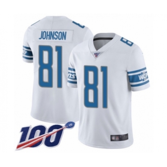 >Men's Detroit Lions #81 Calvin Johnson White Vapor Untouchable Limited Player 100th Season Football Jersey