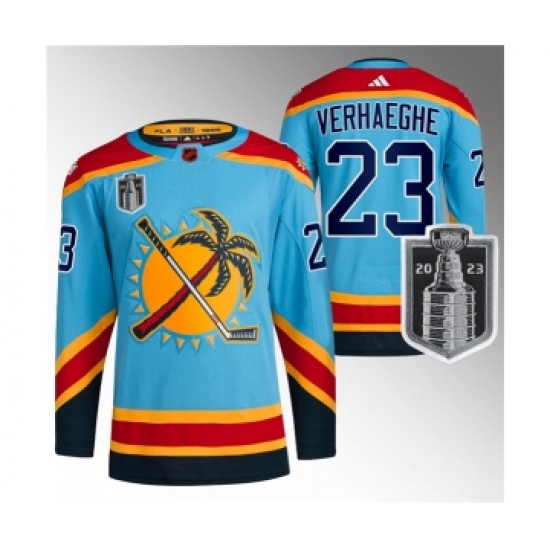>Men's Florida Panthers #23 Carter Verhaeghe Blue 2023 Stanley Cup Final Reverse Retro Stitched Jersey