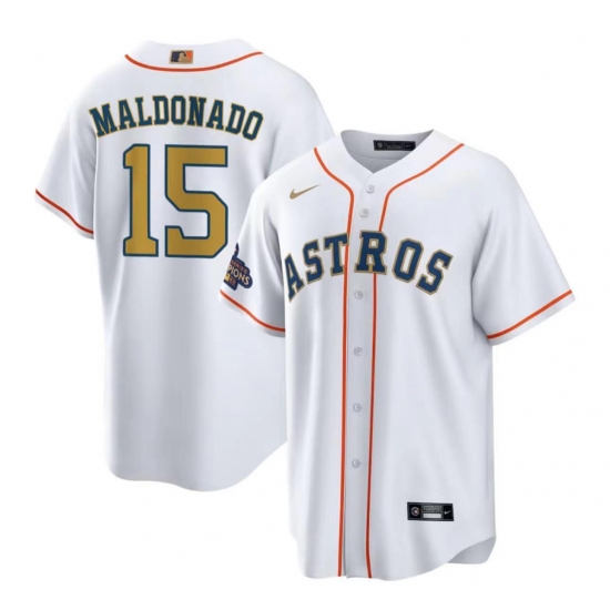 >Men's Houston Astros #15 Martín Maldonado 2023 White Gold World Serise Champions Flex Base Stitched Jersey