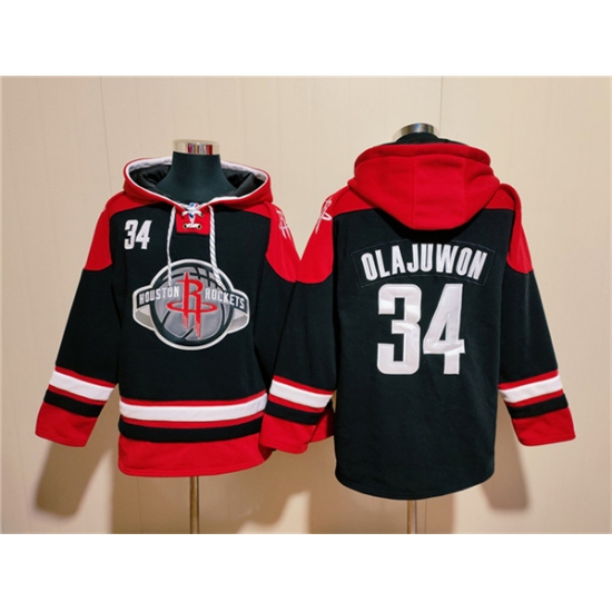 >Men's Houston Rockets #34 Hakeem Olajuwon Black Red Lace-Up Pullover Hoodie
