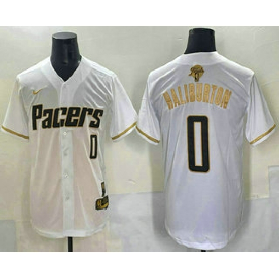 >Men's Indiana Pacers #0 Tyrese Haliburton White Gold 2025 Finals Vapor Stitched Baseball Jersey