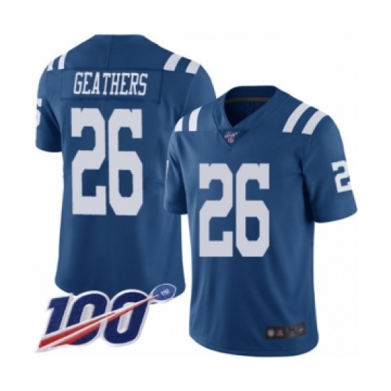 >Men's Indianapolis Colts #26 Clayton Geathers Limited Royal Blue Rush Vapor Untouchable 100th Season Football Jersey