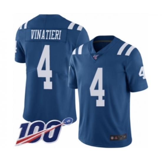 Men's Indianapolis Colts #4 Adam Vinatieri Limited Royal Blue Rush Vapor Untouchable 100th Season Football Jersey