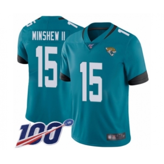 >Men's Jacksonville Jaguars #15 Gardner Minshew II Teal Green Alternate Vapor Untouchable Limited Player 100th Season Football Jersey