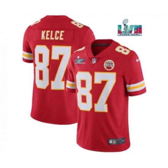 >Men’s Kansas City Chiefs #87 Travis Kelce Red Super Bowl LVII Patch Vapor Untouchable Limited Stitched Jersey