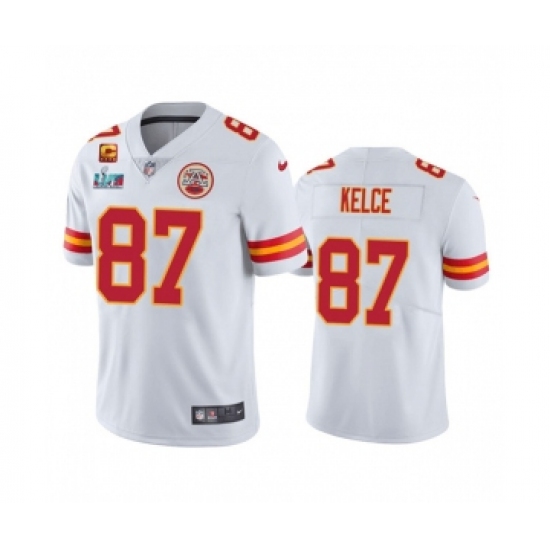 >Men's Kansas City Chiefs #87 Travis Kelce White Super Bowl LVII Patch And 4-star C Patch Vapor Untouchable Limited Stitched Jersey