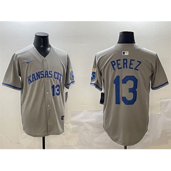 Men's Kansas City Royals #13 Salvador Perez Gray 2024 Away Limited Stitched Baseball Jersey