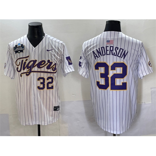 Men's LSU Tigers #32 Kade Anderson White Pinstripe 2025 World Series & SEC Patch Stitched Baseball Jersey
