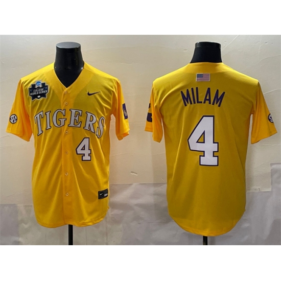 >Men's LSU Tigers #4 Steven Milam Gold 2025 World Series & SEC Patch Stitched Baseball Jersey