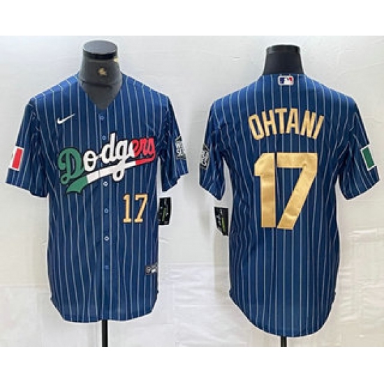 >Men's Los Angeles Dodgers #17 Shohei Ohtani Number Mexico Blue Gold Pinstripe Cool Base Stitched Jersey