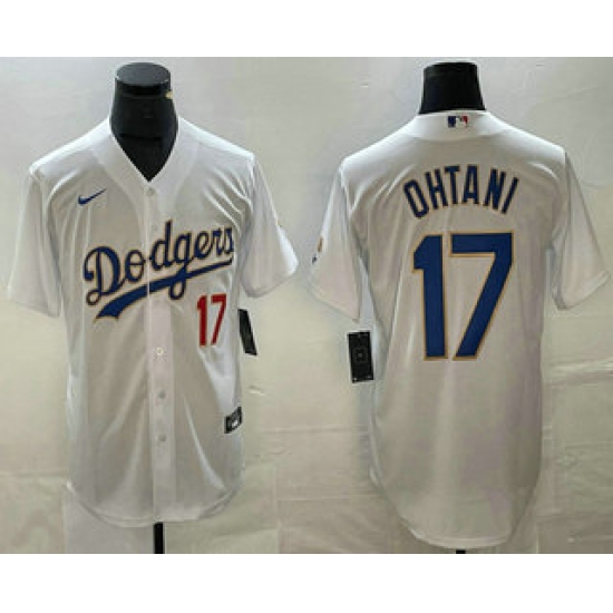 Men's Los Angeles Dodgers #17 Shohei Ohtani White Gold Stitched Cool Base Nike Jersey
