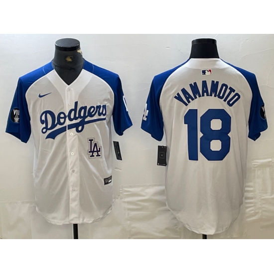 Men's Los Angeles Dodgers #18 Yoshinobu Yamamoto White Blue Fashion Stitched Cool Base Limited Jersey