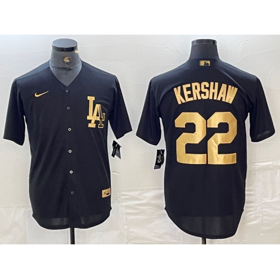 >Men's Los Angeles Dodgers #22 Clayton Kershaw Black Gold Cool Base Stitched Jersey