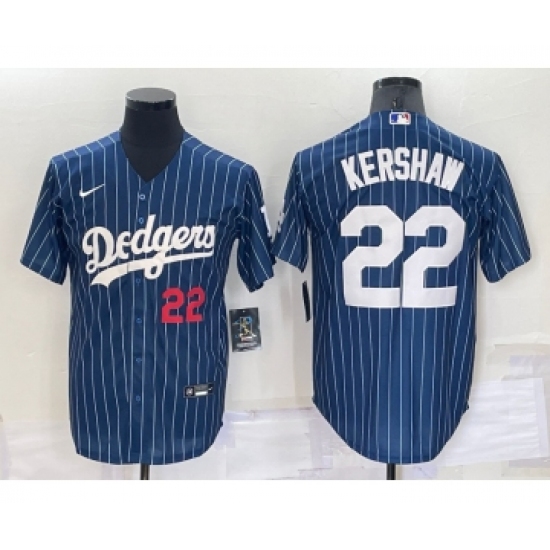 Men's Los Angeles Dodgers #22 Clayton Kershaw Number Red Navy Blue Pinstripe Stitched MLB Cool Base Nike Jersey