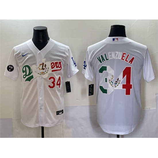 >Men's Los Angeles Dodgers #34 Fernando Valenzuela White Mexico Special Vin Scully Stitched Baseball Jersey