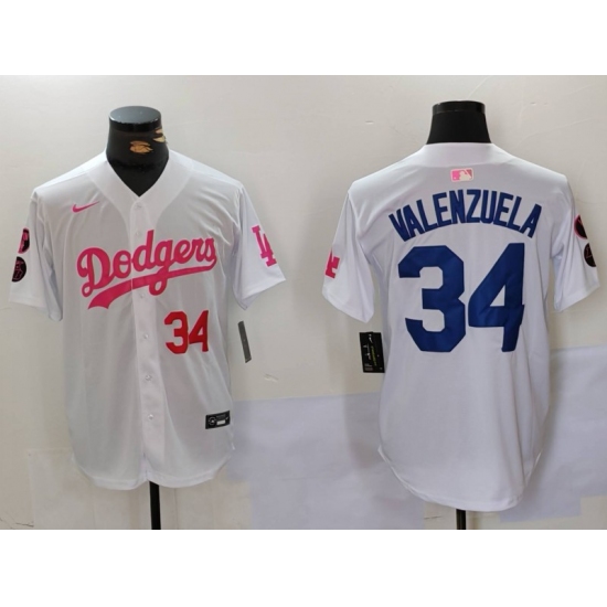 Men's Los Angeles Dodgers #34 Fernando Valenzuela White Pink Vin & Kobe Stitched Baseball Jersey1