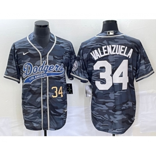 >Men's Los Angeles Dodgers #34 Toro Valenzuela Number Gray Camo Cool Base Stitched Baseball Jersey